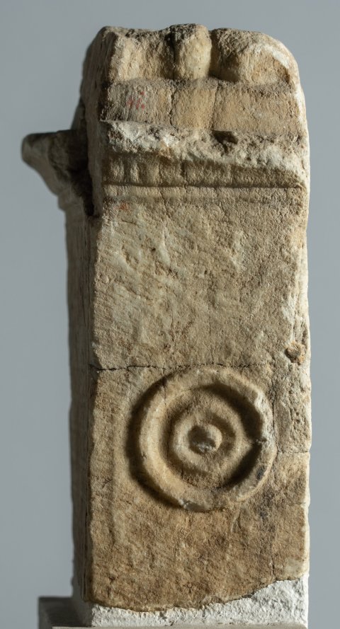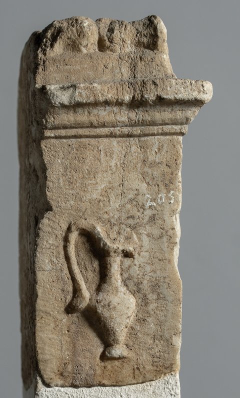 - Volutenpolster (pulvinus) mit Rosetten. Auf der linken Nebenseite Kanne, auf der rechten Schale (patera).