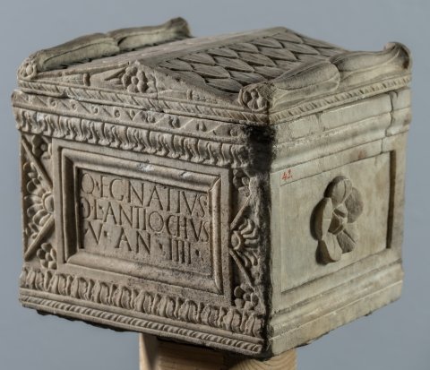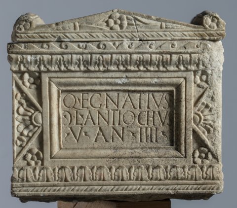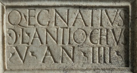 - Q(uintus) Egnatius / |(mulieris) l(ibertus) Antiochus / v(ixit) an(nos) IIII