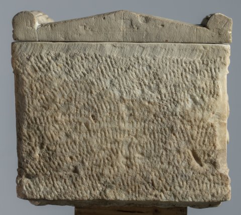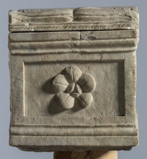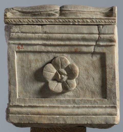 - Dachförmiger Deckel, Seiten zu geschnürten pulvini gedreht. Auf der Vorderseite des Kastens tabula ansata mit Inschrift, in den ansae Palmetten, in den Zwickeln Rosetten, oben und unten Blattkyma, am oberen Rand laufender Hund, am unteren tordierter Rundstab. Auf den gerahmten Nebenseiten Rosette.