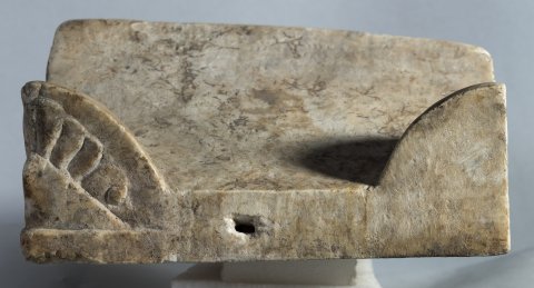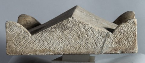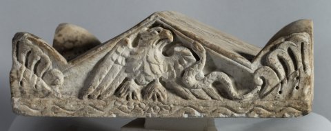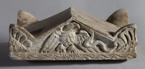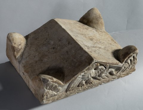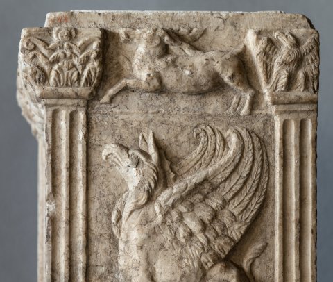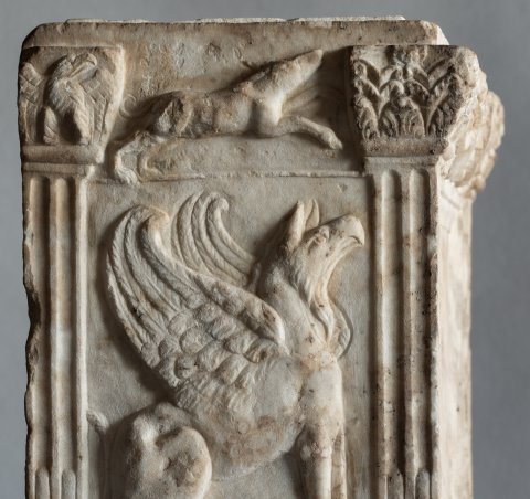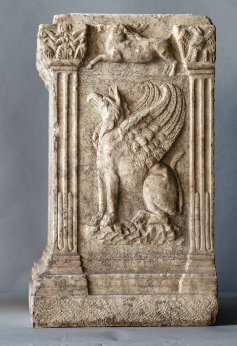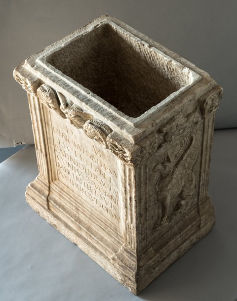 - Altarförmige Aschenkiste mit dachförmigem Deckel mit Eckakroteren und Giebelfeld mit Adler und Schlange; Altarschaft mit kannelierten Eckpilastern, Kapitelle mit Köpfen bzw. Adlern. Auf der Vorderseite profiliert gerahmtes Schriftfeld, darüber Gorgoneion zwischen Widderköpfen. Auf den Nebenseiten je ein sitzender Greif, auf der linken Seite darüber Hund, auf der rechten Hirsch.