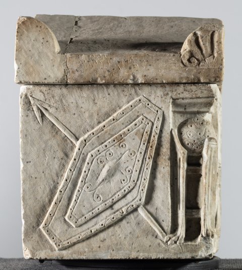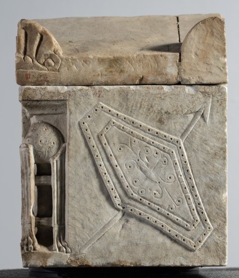 Kasten-Vorderseite (mythische Figur, Musikinstrument): obere Randleiste mit geritzten liegenden S-Haken, darunter Scherenkyma. Gerahmte Schrifttafel, flankiert von Dreifüßen mit Omphaloi. Unter der Inschrift zwei Greife, zwischen ihnen Lyra. Auf der unteren Rahmenleiste geritztes Rankenornament.