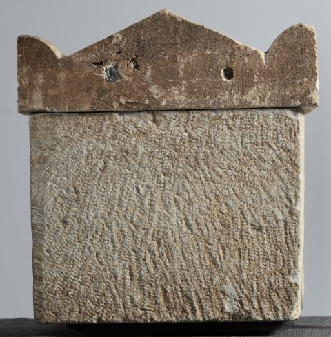 Deckel: dachförmig, Palmetten-Eckakrotere, im Giebelfeld Fruchtkorb zwischen Vögeln.