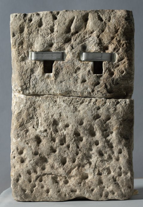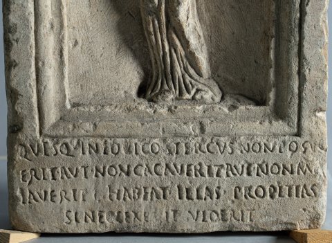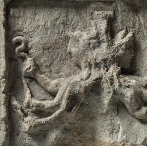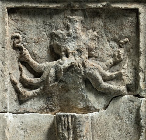 - Mythische Figur (Hekate) : Bildfeld mit profiliertem Rahmen. Stehende dreiköpfige und sechsarmige Göttin mit Polos und langem Chiton, in den Händen Schlangen und Messer.