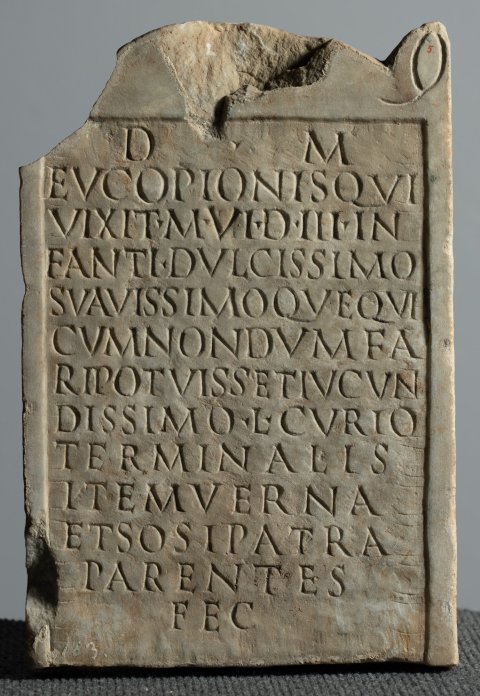 - D(is) M(anibus) / Eucopionis qui / vixit m(enses) VI d(ies) III in/fanti dulcissimo / suavissimoque qui / cum nondum fa/ri potuisset iucun/dissimo L(ucio) Curio / Terminalis / item verna / et Sosipatra / parentes / fec(erunt)