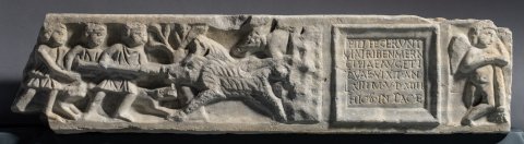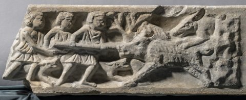 - Jagdszene: Links der gerahmten Inschrift Eberjagd (drei Männer und zwei Hunde von links gegen einen Eber, hinter diesem weiterer Hund, im Hintergrund Baum. Rechts von der Inschrift geflügelter Trauergenius mit gesenkter Fackel.