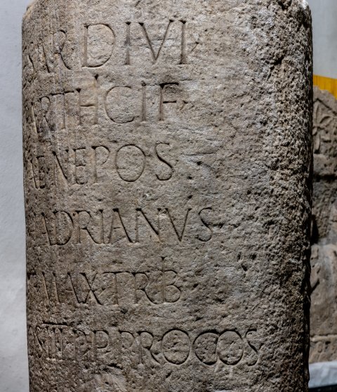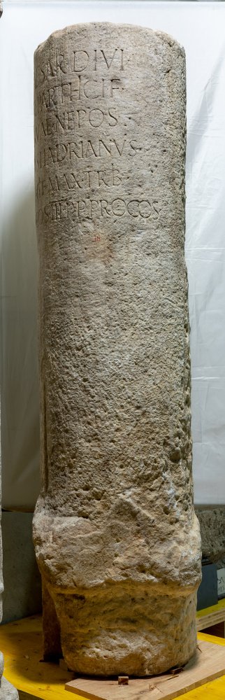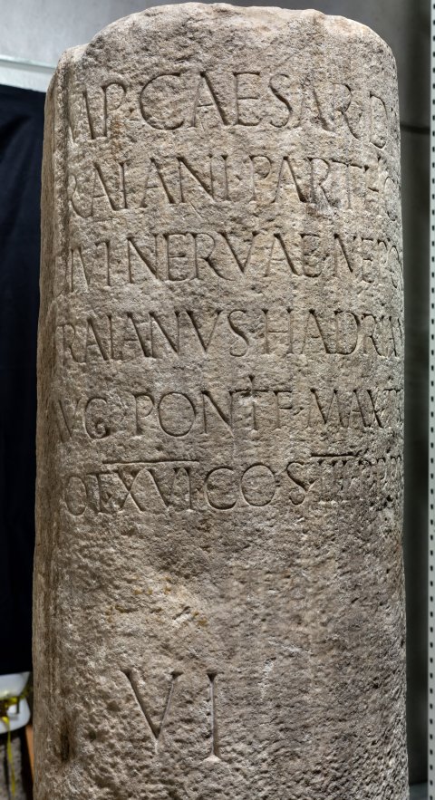 - Imp(erator) Caesar divi / Traiani Parthici f(ilius) / divi Nervae nepos / Traianus Hadrianus / Aug(ustus) pontif(ex) max(imus) trib(unicia) / pot(estate) XVI co(n)s(ul) III p(ater) p(atriae) proco(n)s(ul) / VI