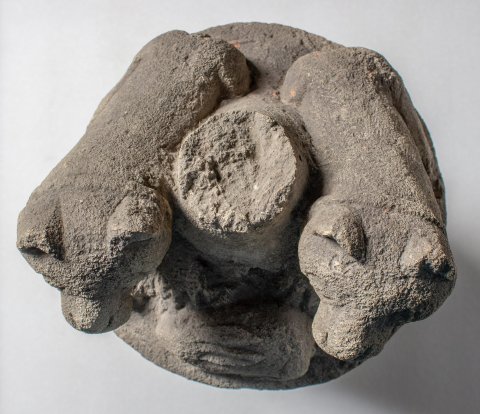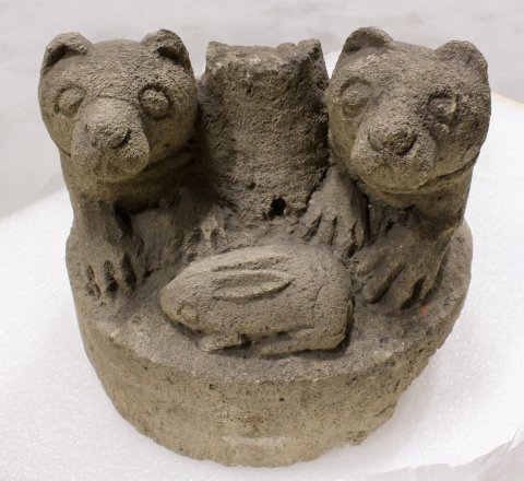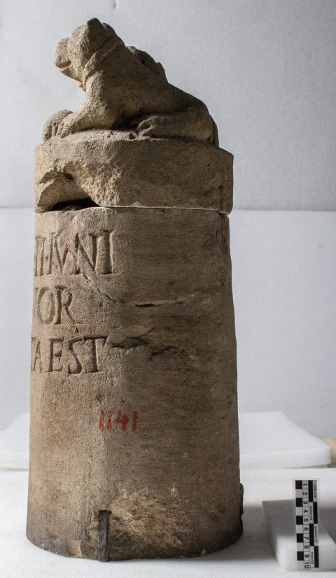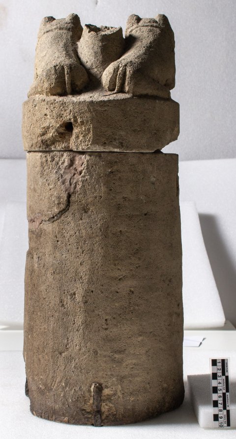 - Tiere : Zylindrisches Gefäß mit ebensolchem Deckel. Auf dem Deckel liegen seitlich eines Säulenstumpfes zwei Hunde mit Halsband, vor ihnen liegender Hase.