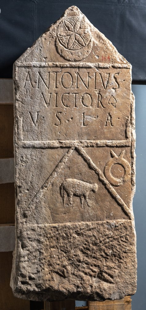 - Im einfach gerahmten Giebelfeld Rosette über Mondsichel zwischen zwei Sternen. Darunter Schriftfeld. Unter diesem Dreieck (Tanit-Symbol ?) mit Tier (Widder), im rechten Zwickel Kranz (?).
