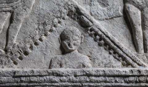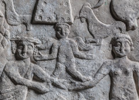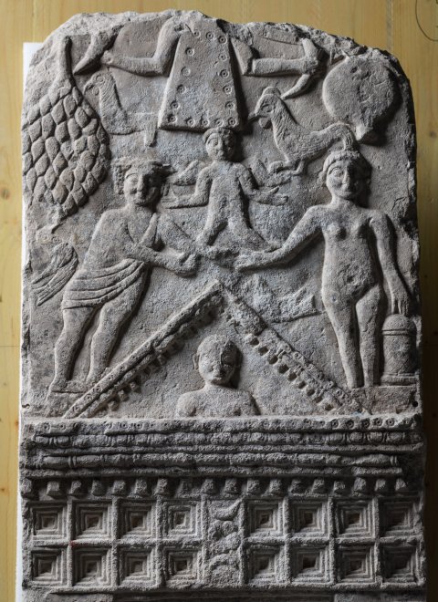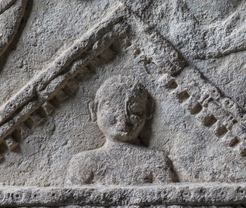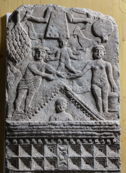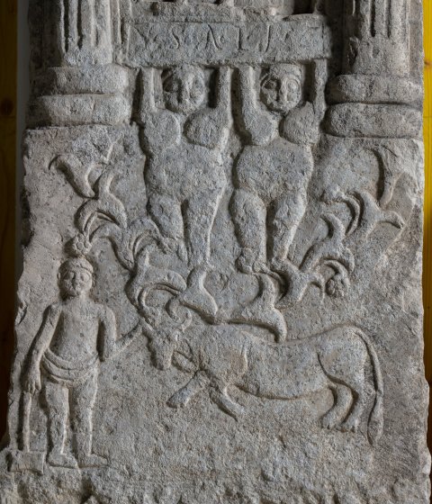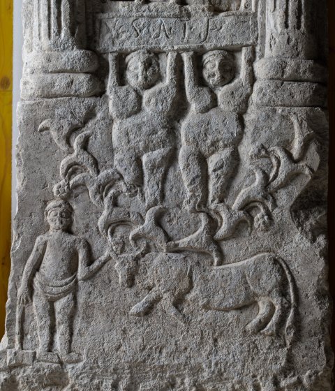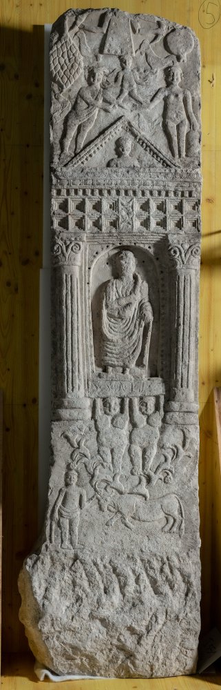 - Mann, Genius, mythische Figur, Tiere, Opferszene : Im ungerahmten Giebelabschluss langgewandete, von zwei Hähnen flankierte Gestalt (Dea Caelestis) mit Füllhörnern in den Händen, aus denen links eine Traube, rechts ein Granatapfel herunterhängen. Darunter links männliche Figur mit Mäntelchen und Trauben im Haar (Dionysos), rechts nackte weibliche Figur (Venus) mit Ciste neben dem linken Bein. Beide reichen sich die Hände, auf denen ein nackter geflügelter Genius steht. Darunter gerahmtes Giebelfeld mit Knaben(?)büste. Profiliertes Gesims, doppelter Kassetten-Fries, Bogennische zwischen kannelierten Säulen. In der Nische sitzender Togatus, unter seinen Füßen Inschrifttafel, die von zwei nackten Karyatiden getragen wird. Unter diesen Blütengirlande und Opferszene (stehender Mann, in der Rechten Axt, in der Linken Horn eines zusammenbrechenden Stiers).