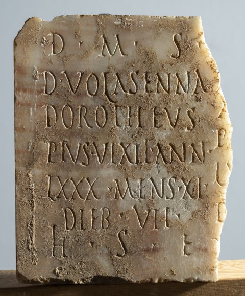 - D(is) M(anibus) s(acrum) / D(ecimus) Volasenna / Dorotheus / pius vixit ann(is) / LXXX mens(ibus) XI / dieb(us) VII / h(ic) s(itus) e(st) // ] / D[---] / A[---] / pi[a vixit annis] / LX mens(ibus) [---] / d[ieb(us) ---] / h(ic) [s(ita) e(st)]