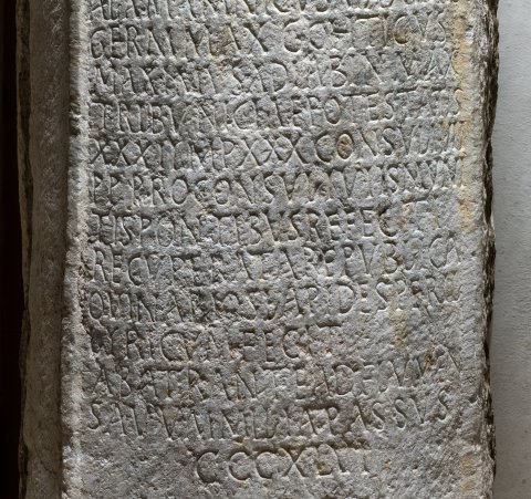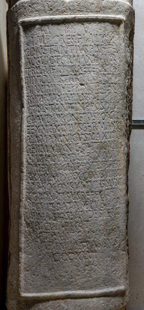 - M(ilia) p(assuum) V / Imp(erator) Caes(ar) Fla(vius) Iul(ius) / Constantius pius fel(ix) / Aug(ustus) victor maximus / triumfator aeternus / divi Constantini optimi / maximique principis divo/rum Maximiani et / Constanti nepos divi / Claudi(i) pronepos ponti/fex maximus Germanicus / Alamamnicus (!) maximus / Germ(anicus) max(imus) Gothicus / maximus Adiabin(icus) (!) max(imus) / tribunicia postestatis / XXXI imp(erator) XXX consul IIII / p(ater) p(atriae) proconsul viis muni/tis pontibus