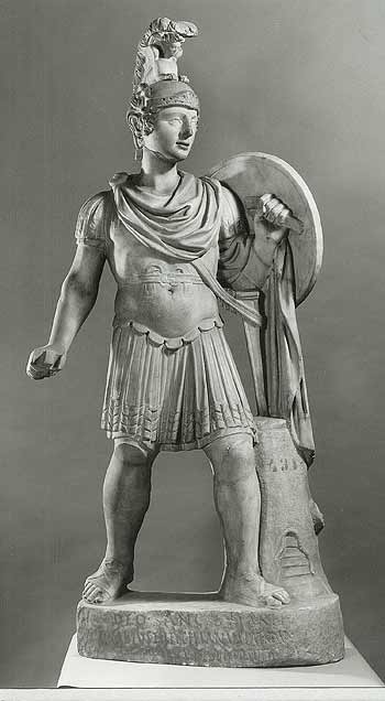 - Mythische Figur: Auf abgerundeter Sockelplatte stehender Mars (Panzer, Mantel, Helm, in der Linken Rundschild, in der Rechten Schwert ?) in Schrittstellung, neben dem linken Bein Stütze.