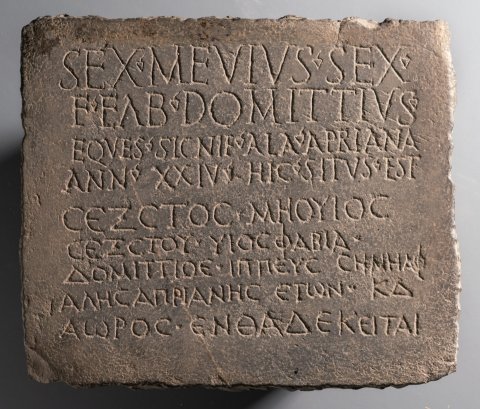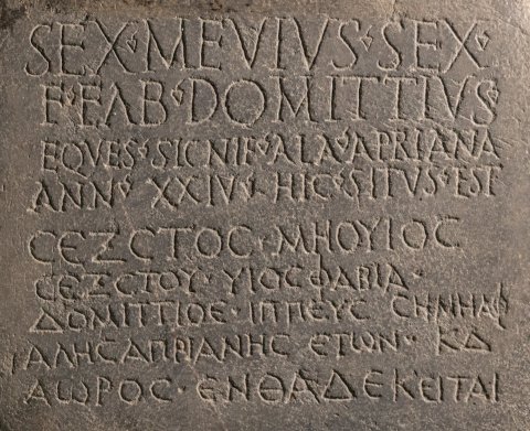 - Sex(tus) Mevius Sex(ti) / f(ilius) Fab(ia) Domitius / eques signif(er) ala(e) Apriana(e) / ann(orum) XXIV hic situs est / griechisch : Σέξστος Μήουιος / Σέξστου υἱὸς Φαβία / Δομίττιος ἱππεὺς σημμαφ(όρος) / ἄλης Ἀπριανῆς ἐτῶν κδʹ / ἄωρος ἐνθάδε κεῖται