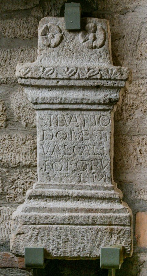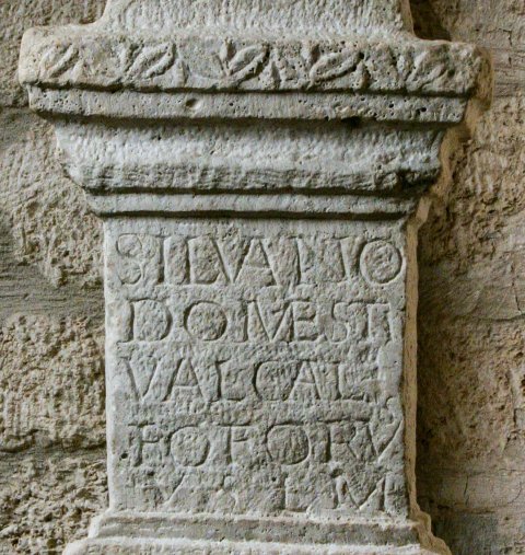 - Silvano / Domesti(co) / Val(erius) Cal/boforus / v(otum) s(olvit) l(ibens) m(erito)