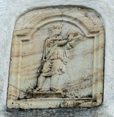 - Diener (Librarius - Scriba): in Bogennische auf flachem Podest Mann in kurzer Tunica, schreibt mit Stilus in Diptychon.