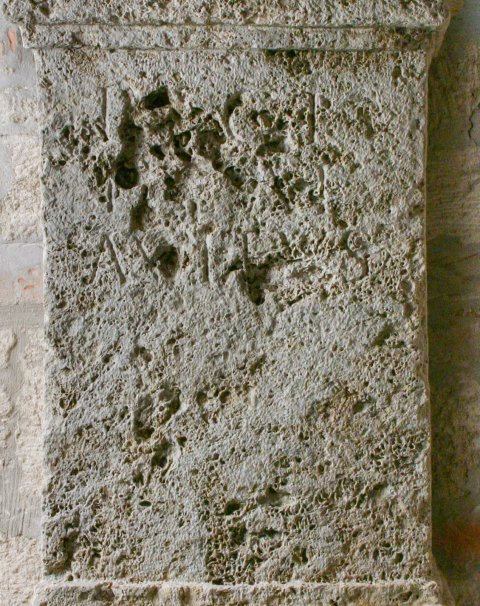 - stark bestoßen. Rote Farbe auf Gesims, Sockel und in den Buchstaben