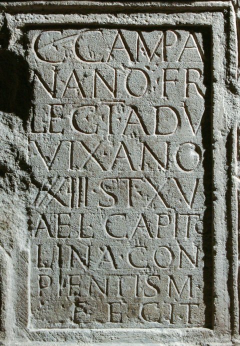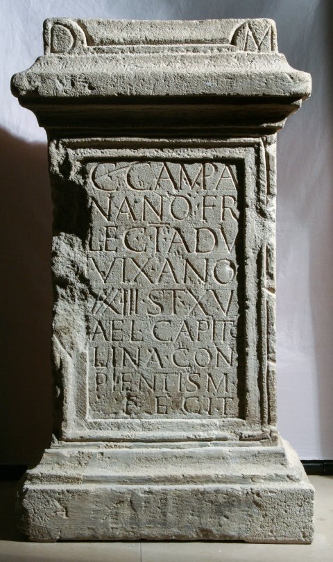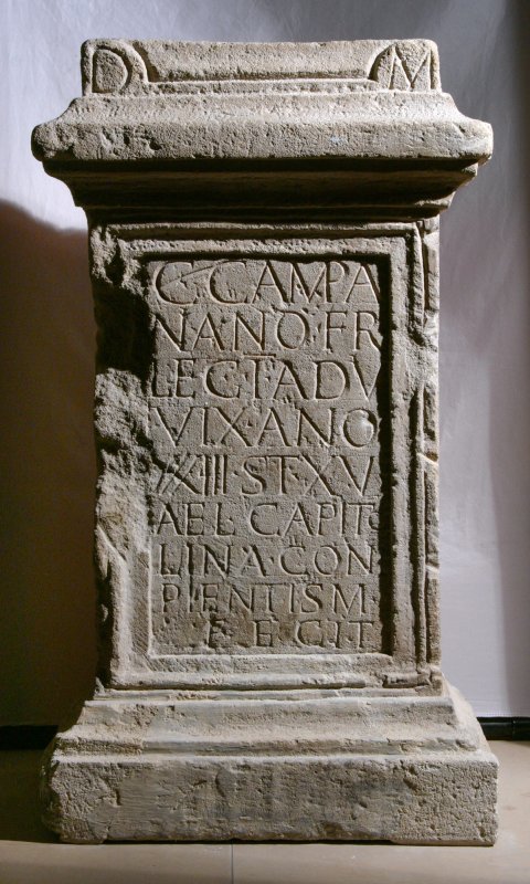 - D(is) M(anibus) // C(aio) Campa/niano fr(umentario) / leg(ionis) I Adiu(tricis) / vix(it) an(n)o(rum) / XXXIII st(ipendiorum) XV / Ael(ia) Capito/lina coni(ugi) / pientis(si)m(o) / fecit