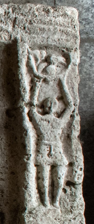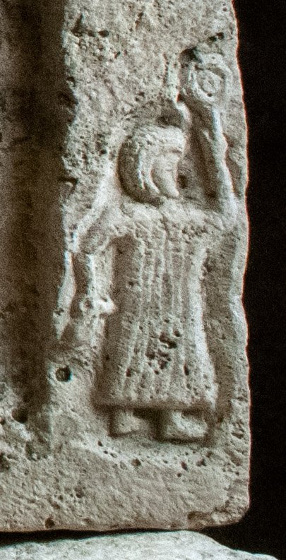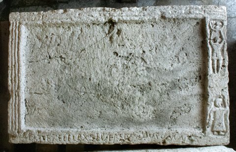- Flüchtig geglättetes Feld mit vorspringendem Rahmen. Oben und links kannelliert, unten Inschrift, rechts zwei eingetiefte Bildfelder mit Diener, der ein Gefäß mit Speisen über den Kopf hebt (oben) und Dienerin mit Krug in der Rechten und Griffschale (Patera) in der erhobenen Linken.