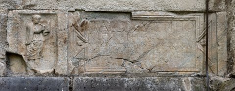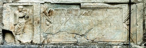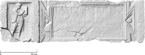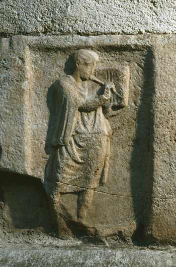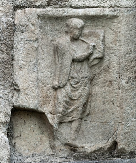 - Im linken Seitenfeld Diener (Librarius - Scriba): Lockenfrisur, kurze Tunica, schreibt mit einem Stilus in ein Diptychon. Inschrift in tabula ansata.