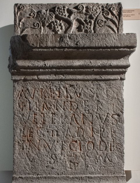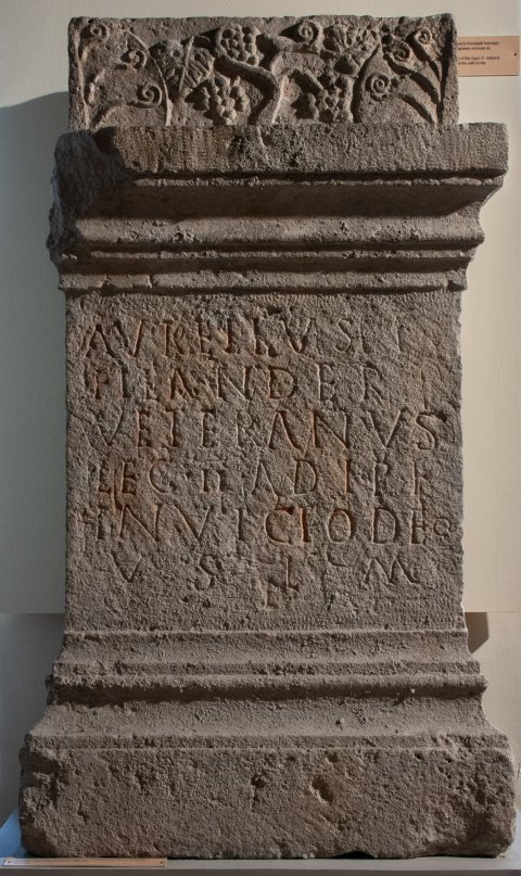 B) Aurelius / Filander / veteranus / legionis II adi(utricis) p(iae) f(idelis) / Invicto Deo / votum s(olvit) l(ibens) m(erito)
