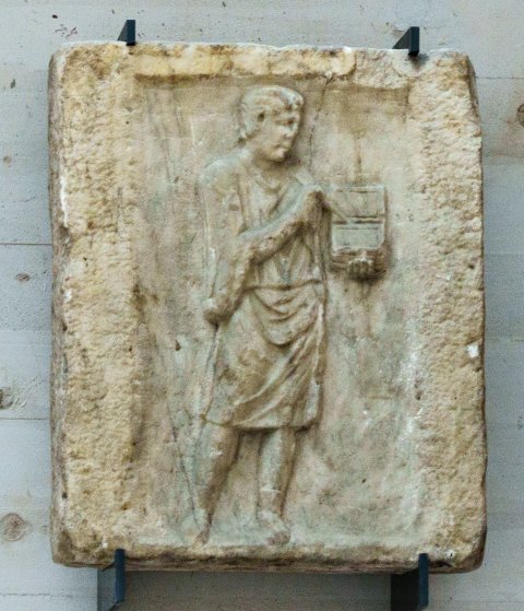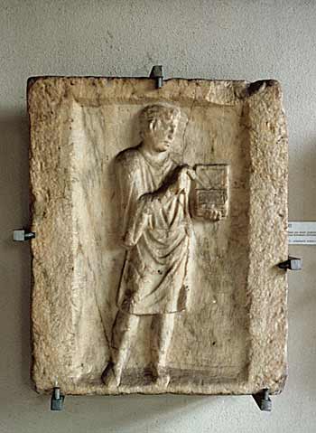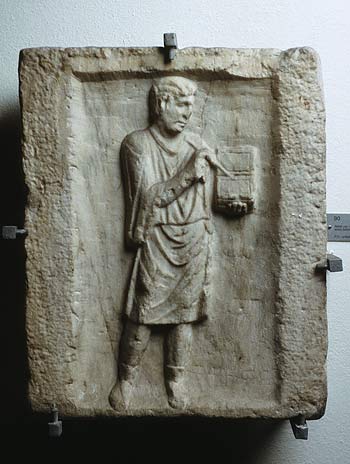 - Diener (Librarius - Scriba): in Rechtecknische Mann in kurzer Tunica und Stiefeln, schreibt mit Stilus in Diptychon.