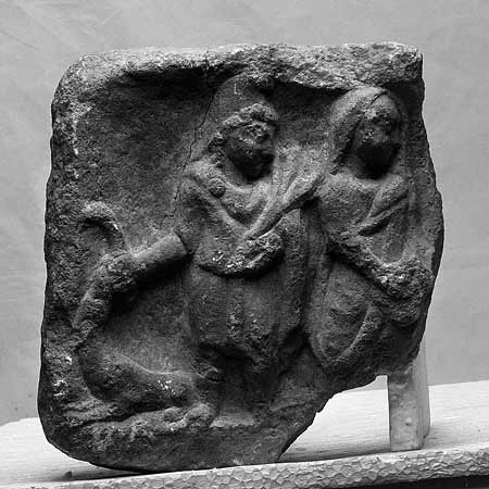 - Mythische Figur: einfach gerahmte Tafel, links stehender Silvanus mit phrygischer Mütze, Mantel und kurzer Tunica, in der Rechten Winzermesser, im linken Arm Pedum, neben dem rechten Fuß liegender Hund. Neben Silvanus stehende Frau mit über den Kopf gezogenem Mantel. Beide Gottheiten schauen nach rechts. Rest einer Weihinschrift auf dem unteren Rand.