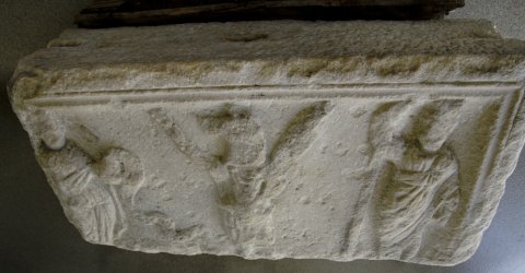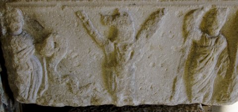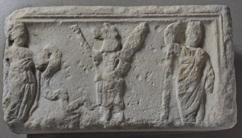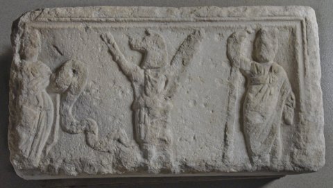 - Mythische Figur (Hygieia-Isis, Aesculapius-Sarapis) : rechteckiges Bildfeld mit profiliertem Rahmen. Drei stehende Ganzfiguren: in der Mitte bekleidete Figur mit Anubismaske (Priester ?), in der Rechten Caduceus, im linken Arm ?. Links weibliche Figur in Chiton und Mantel, an ihrer linken Seite große Schlange. Rechts bärtiger Mann im Mantel (Toga ?) , in der Rechten langer Stab.