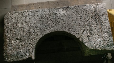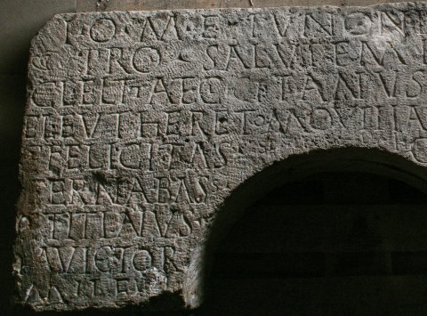 - I(ovi) O(ptimo) M(aximo) e(t) Iunoni regin(a)e / pro salutem(!) imperi(i) / Cl(audius) ELTTA et Cl(audius) Citanus C(laudius) Feli[x] m(agister?) pr(imus?) / Eleuther et M() QVIIIA Cl(audi) Felicis ma(gistri?) / C[l](audi) Felicitas / (A)eterna Bass(us) / si(g)nifer le(gionis) I / Cl(audius) Titianus / [Cl]a(udius?) Victor / miles le(gionis) I / Cl(audius) Crescentin(us) / Cl(audius) Cresce(n)s / Cl(audia) Maura / libert[a]
