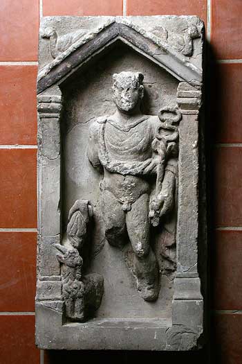 - Mythische Figur: Glatte Pfeiler tragen offenen profilierten Giebel, auf den Ecken Wasservögel. In der Giebelnische stehender Mercur mit Flügelkappe, Mantel mit Scheibenfibel, im linken Arm Caduceus, in der Rechten Geldbeutel. Neben dem rechten Bein stehender Ziegenbock.