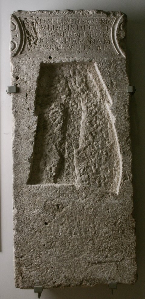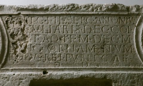 - C(aius) Tit(ius) C(ai) f(ilius) Serg(ia) Antonius / P[e]culiaris dec(urio) col(oniae) / S[e]pt(imiae) Aq(uinci) item dec(urio) m(unicipii) / S[i]ng(iduni) ornamentum / forus (!) rei publicae / d(onum) d(edit)