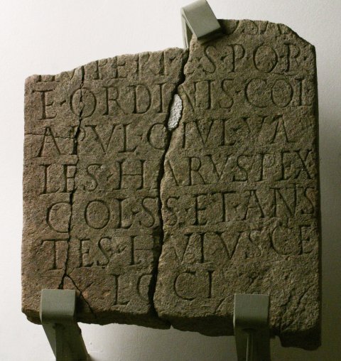 - [Veneri Vic]/[trici p]ro sal(ute) / imperi(i) et s(enatus) p(opuli)q(ue) R(omani) / et ordinis col(oniae) / Apul(ensis) C(aius) Iul(ius) Va/le(n)s haruspex / col(oniae) s(upra) s(criptae) et antis/tes huiusce / loci / [v(oto) l(ibens)] p(osuit)
