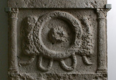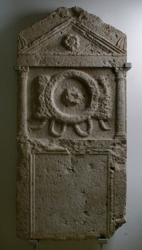 - Giebel: profilierter Rahmen, Rosette und Eckakrotere. Hauptbild: Kranz mit Tänien zwischen Säulen, Relief unfertig. Schriftfeld mit profiliertem Rahmen.