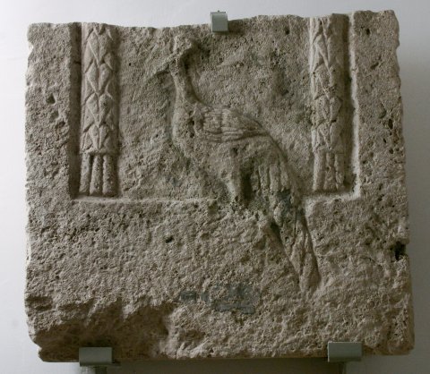 - Tier: eingetieftes Bildfeld, auf dem unteren Rand stehender Pfau zwischen Palmstämmen (?).