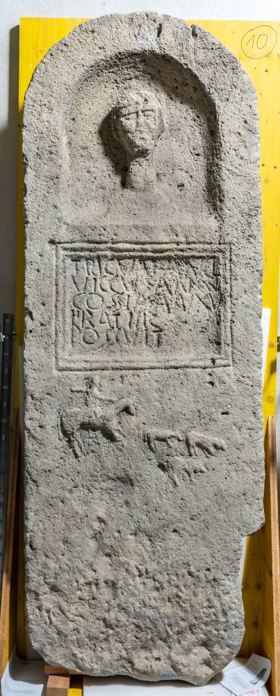 - Halbrunder Stelenabschluss, Büste in Bogennische, einheim. Namen.