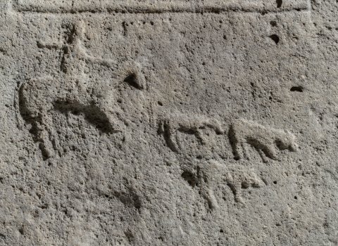Im Sockelbild Jagdszene: Reiter mit Lanze, vor ihm zwei Hunde, ein Eber. - Inschrift