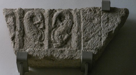 - Fragment eines Friesbalkens ? Delphine in drei durch dreikantige vertikale Leisten getrennten Feldern, rechts geglättete Fläche.
