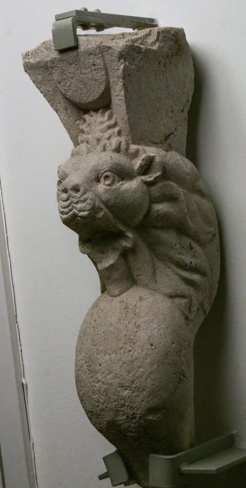 - Tischbein in Form eines Löwenbeines mit Löwenprotome. Auf dem Löwenkopf trapezoider Aufsatz.