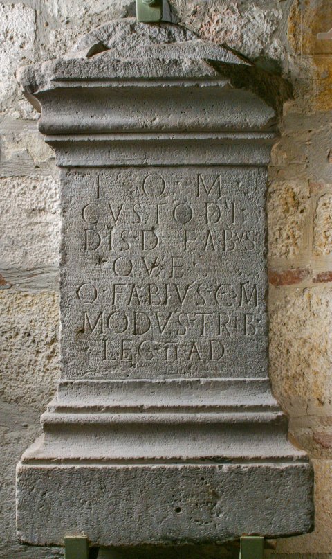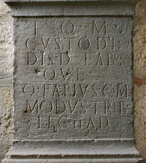 - I(ovi) O(ptimo) M(aximo) / Custodi / dis deabus/que / Q(uintus) Fabius Com/modus trib(unus) / leg(ionis) II Ad(iutricis)