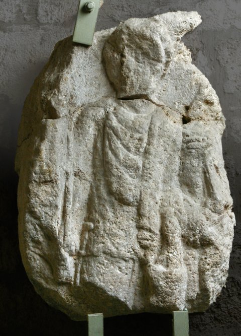 - Stehender Mann (Soldat) im Sagum, in der gesenkten Rechten langer Stab (?). Waffen: an der rechten Hüfte Schwert. Rechts Reste einer weiteren Figur. Grabrelief ?