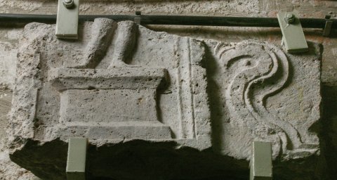 - Genius : links profiliert gerahmtes Bildfeld mit auf Podest stehendem Knaben (nur Beine erhalten). Rechts Rest des geschwungenen Rahmens (sogen. Barockmotiv) eines Schriftfeldes.