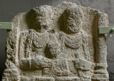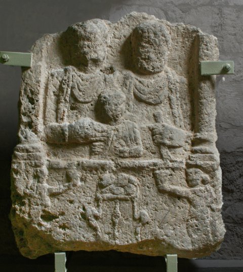 - Familie : im Hauptbild zwischen Säulen Halbfiguren von zwei Männern im Sagum mit Scheibenfibel. Der rechte bärtig, in der Linken Rolle (volumen). Vorn Kind. Darunter Zwischenbild mit Totenopfer (dreibeiniger Tisch mit Speisen, links Diener, rechts Dienerin, beide mit Gefäß in der erhobenen Hand).