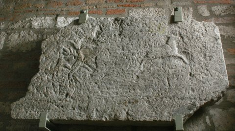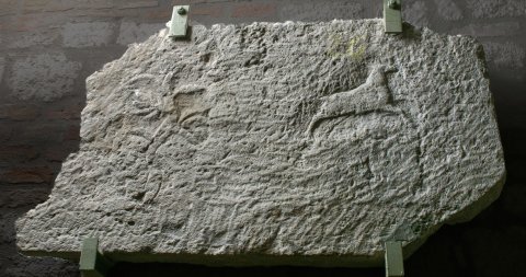 - Tier: in sehr flachem Relief auf ungerahmter Platte nach rechts springender Hirsch (?), links Baum. Jagdszene ?
