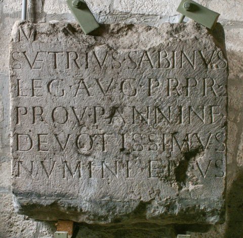 - Imp(eratori) A[ntonino A]u[g(usto)] / Suetrius Sabinus / leg(atus) Aug(usti) pr(o) pr(aetore) / prov(inciae) Pann(oniae) Inf(erioris) / devotissimus / numini eius