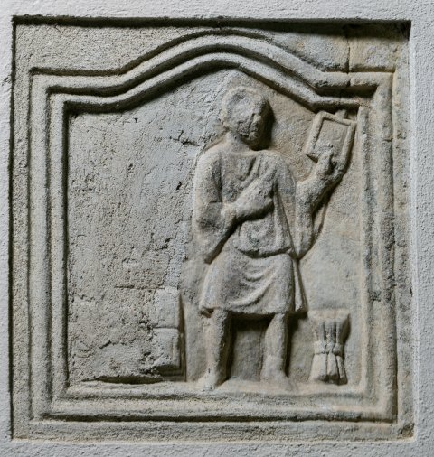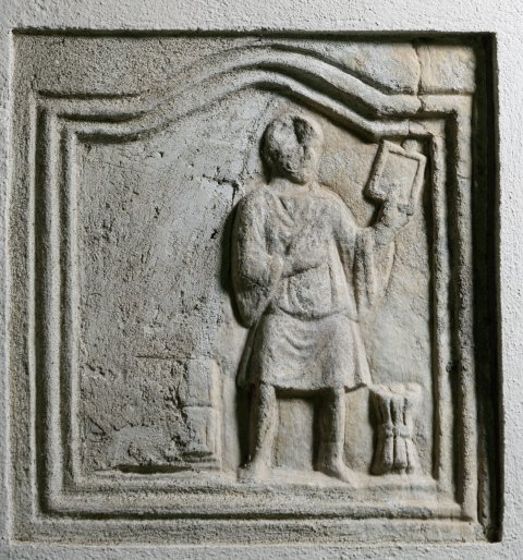 - Diener (Librarius - Scriba): in Giebelfeld Mann in kurzer Tunica, in der Rechten Stilus, in der Linken Schreibtafel. Links unten aufgeklapptes Diptychon, rechts Rollenbündel.