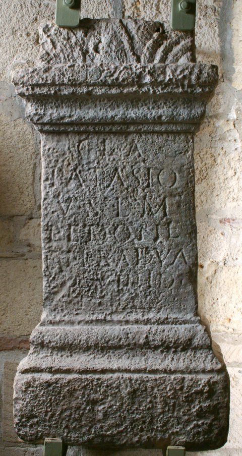 - [I(nvicto)] D(eo) S(oli) M(ithrae) // Cla(udius) / Patasio / v(otum) s(olvit) l(ibens) m(erito) / Pedone / et Bradua / co(n)s(ulibus) VIII Id(us) / Iunias