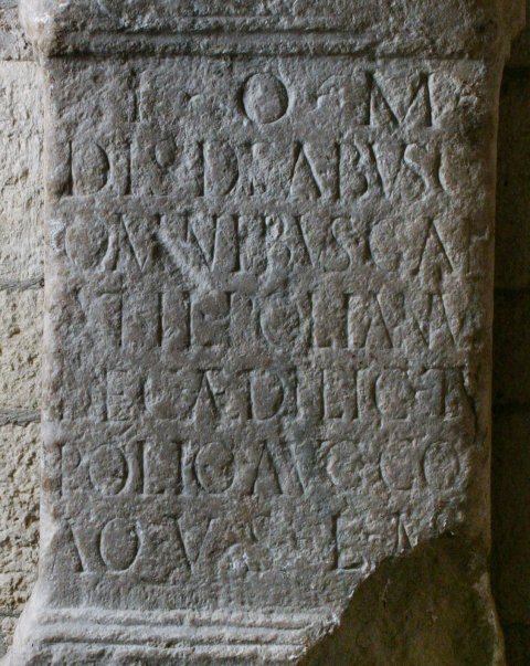 - I(ovi) O(ptimo) M(aximo) / dis deabusq(ue) / omnibus GA+[-] / Atil(ius) Pol(l)ianus / dec(urio) aedilic(ius) et / Pol(l)io aug(ustalis) co[l(oniae)] / Aq(uincensium) v(otum) s(olverunt) l(ibentes) m(erito)