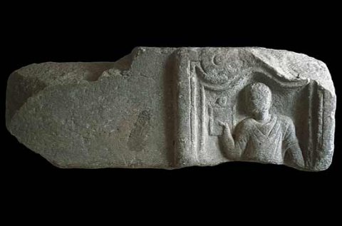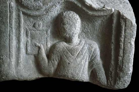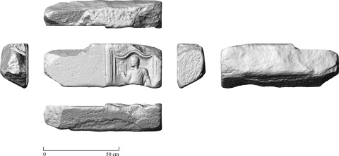 - Diener (Librarius - Scriba): Rechts Bildfeld mit profiliertem, oben geschwungenem Rahmen. Mann in Tunica, in der Rechten Schreibtafel. Links anschließend leeres Feld (Inschrift nicht ausgeführt ?).