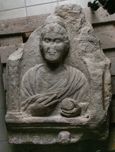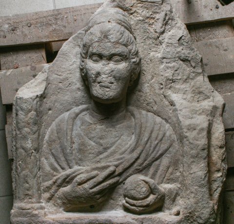 Hauptbild : Brustbild einer Frau in Tunica und Mantel, Frisur der Faustina Maior, in der Linken Apfel. Am linken Rand Säule mit Blattschuppen, rechts verbrochene Säule und Ansatz eines 2. Bildfeldes. Profiliertes Gesims als unterer Abschluss.