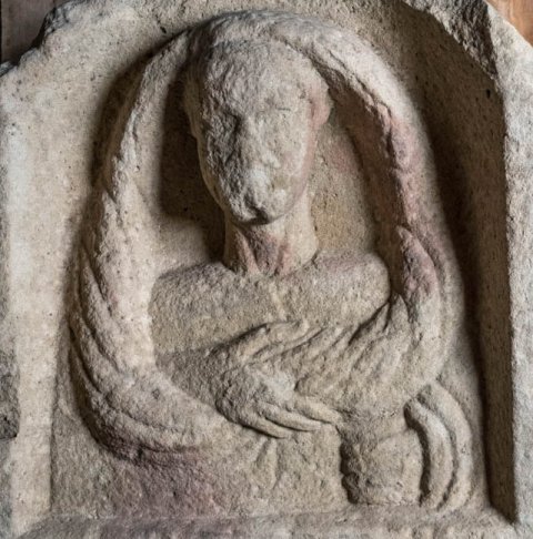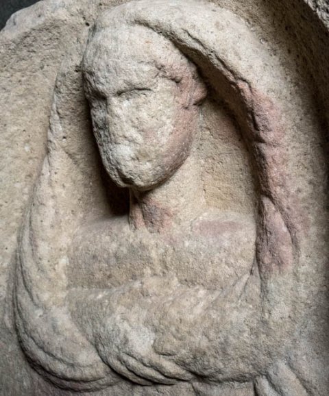 - In Bogennische Brustbild eines bartlosen (?) Mannes, Mantel (Paenula-Kapuze ?) über den Kopf gezogen.