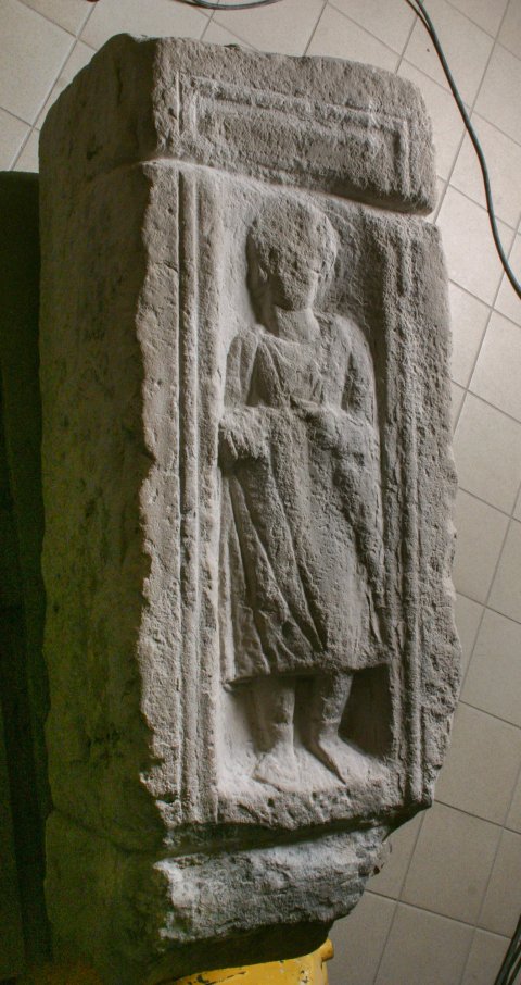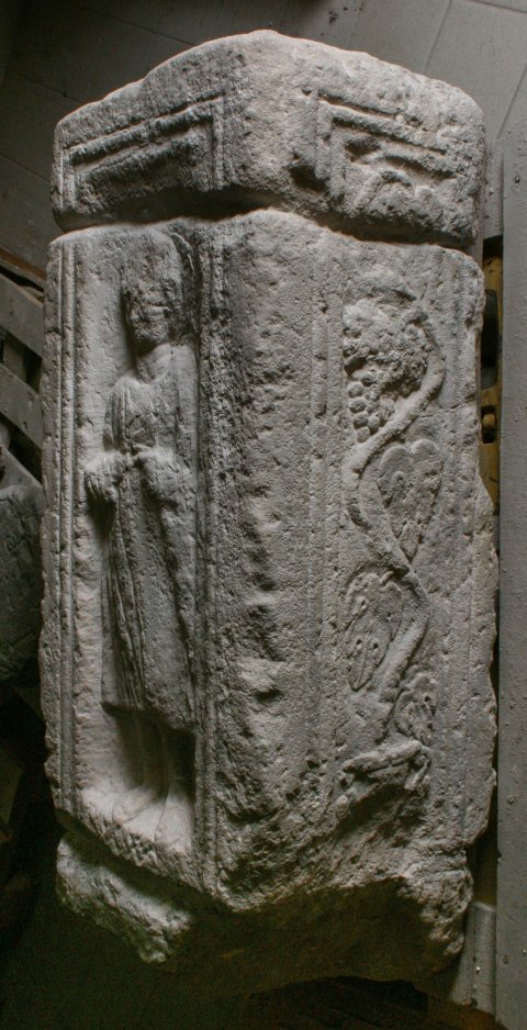 - Eckpilaster. Auf Vorder- und rechter Nebenseite profiliert gerahmtes Bildfeld. Rechts Krater mit Weinranke, vorn Mann (Diener ?) in halblanger Ärmeltunica und hohen Schuhen.